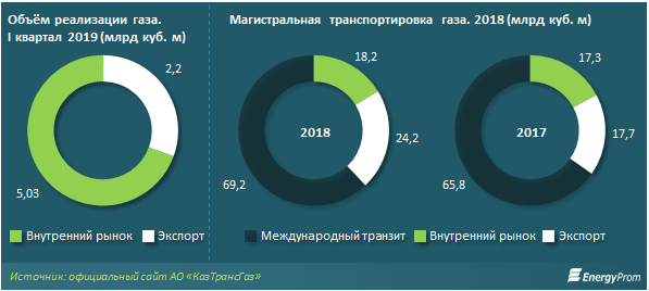 По итогам 2018-го экспортные поставки газа увеличились почти на 37% в сравнении с предыдущим годом и составили уже 24,2 млрд куб. м (в 2017-м — 17,7 млрд куб. м). Внутренние транспортировки газа составили 18,2 млрд куб. м — на 4,7% больше, чем в 2017 году. Вырос и международный транзит: на 5,1% к предыдущему году, до 69,2 млрд куб. м. В целом, согласно данным Национального оператора в сфере газотранспортировки и газоснабжения АО «КазТрансГаз», дочернего предприятия АО «НК „КазМунайГаз“», объёмы магистральных транспортировок газа в стране увеличились на 10,6% за год, до 111,6 млрд куб. м. Только за I квартал текущего года экспортные поставки газа уже составили 2,2 млрд куб. м, поставки на внутренний рынок — более 5 млрд куб. м, сообщил национальный оператор.