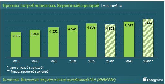 По данным Института энергетических исследований РАН, газ в перспективе до 2040 года будет лидировать по объёмам абсолютного прироста потребления среди всех энергоресурсов: в вероятном сценарии в 2040 году мировой спрос на газ составит около 5 трлн куб. м, с абсолютным приростом почти на 1,5 трлн куб. м и ежегодными темпами 1,4%. Даже при замедлении темпов роста потребления газа его доля в мировом энергобалансе вырастет в этом сценарии до 24% к 2040 году.