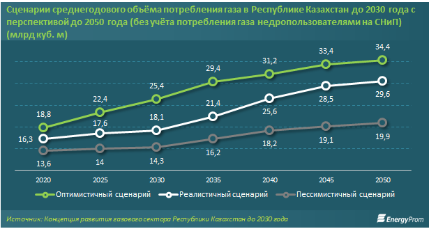 В то же время на внутреннем рынке РК также заметно растёт потребление газа. Согласно «Концепции развития газового сектора до 2030 года», рассмотрено три сценария, рассчитанных в зависимости от газификации регионов страны. «Оптимистичный» сценарий, то есть сценарий максимально активного роста потребления газа, может стать результатом масштабного развития в Казахстане газохимической промышленности, реализации инициатив по ускоренному развитию газовых генераций в рамках перехода Республики Казахстан к «зелёной экономике», а также реализации планов по максимальному охвату газоснабжением населения и коммунально-бытовых потребителей Республики Казахстан. По этому сценарию потребление товарного газа в республике составит 25,4 млрд куб. м к 2030 году и 34,4 млрд куб. м — к 2050 году.