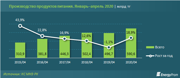 В январе–апреле текущего года в стране произвели продуктов питания на сумму 590,6 млрд тг, рост с учётом инфляции составил 2,4%. Наибольший объём производства пришёлся на Алматинскую (89,3 млрд тг) и Костанайскую (75,6 млрд тг) области, замыкает ТОП-3 город Алматы (74,9 млрд тг).