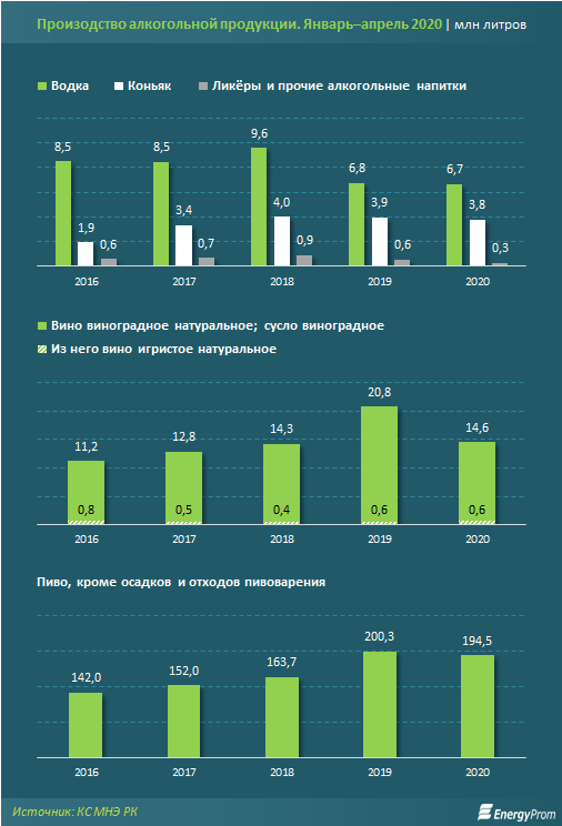 Производство алкогольной продукции за январь–апрель в Казахстане сократилось по сравнению с аналогичным периодом прошлого года по всем основным категориям. Так, производство водки уменьшилось на 1,1%, до 6,7 млн литров, коньяка — на 4,6%, до 3,8 млн литров, ликёра и прочих крепких алкогольных напитков — сразу на 51,1%, до 281 тыс. литров.