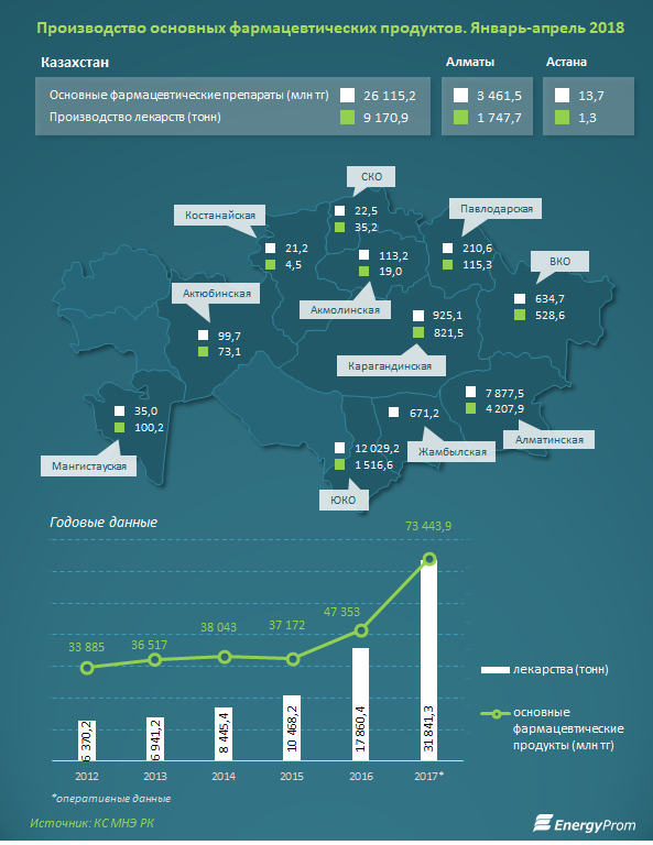 В стоимостном выражении объемы выпуска основных фармацевтических препаратов составили 26,1 млрд тг за январь-апрель 2018 — это на 2,7% меньше, чем в аналогичном периоде годом ранее.