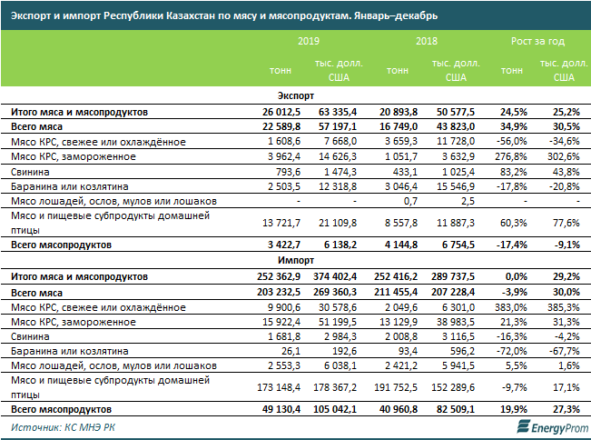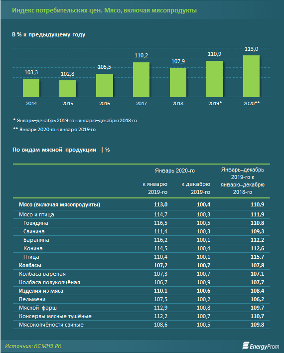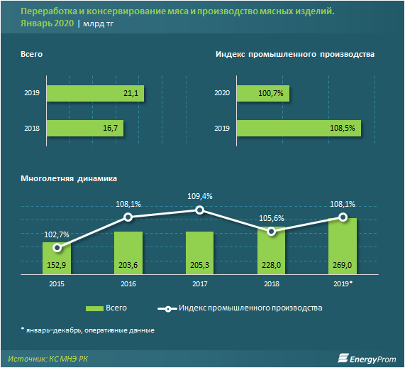 При этом непосредственно выпуск мяса растёт: за январь 2020 года в Казахстане произвели, переработали и законсервировали мяса и мясных изделий на сумму 21,1 млрд тенге; рост с учётом инфляции, по данным КС МНЭ РК, составил 0,7%. В целом за январь–декабрь 2019 года в стране произвели мяса и мясных изделий на 269 млрд тг, реальный рост составил 8,1%.