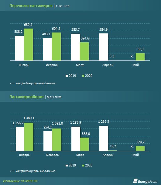 Непосредственно в мае 2020 года пассажироперевозки воздушным транспортом выросли до 165,1 тыс. чел. — в 30,9 раза больше, чем в «карантинном» апреле, когда самолетами было перевезено всего 5,3 тыс. чел.