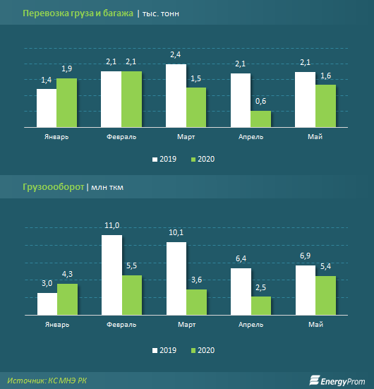 Грузооборот за пять месяцев составил 21,3 млн тонно-километров — на 43,1% меньше, чем годом ранее. В мае грузооборот достиг 5,4 млн ткм, увеличившись по сравнению с «карантинным» апрелем в 2,1 раза.