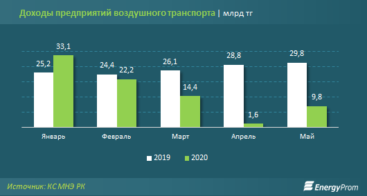 За пять месяцев 2020 года казахстанские авиакомпании заработали 81,1 млрд тг — на 39,7% меньше, чем годом ранее. Большая часть дохода (96,3%) была получена за счёт перевозок багажа и грузов, на долю перевозок пассажиров пришлось лишь 3,7%. В мае авиакомпании заработали 9,8 млрд тг — в 6 раз больше, чем в апреле текущего года.