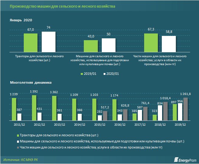 По итогам всего 2019 года отмечен скачкообразный рост по всем категориям. Было произведено 897 тракторов — больше, чем за два предыдущих года, вместе взятых. Выпуск в секторе после двухлетней стагнации приближается к докризисным значениям. Выросло и производство техники для подготовки и культивации почвы — на 14,6%, до 956 машин. Было произведено 512 жаток и 381 комбайн.