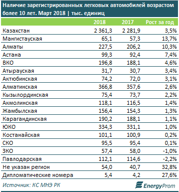 Регионы, где количество легковых автомобилей возрастом более 10 лет, наоборот, за год сократилось — ЗКО (на 1%, до 57,4 тысячи) и Павлодарская область (на 2,2%, до 112,1 тысячи).