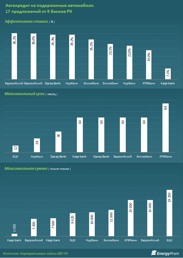 Автокредит на подержанные автомобили предлагают 9 из 32 БВУ РК. Возраст приобретаемых автомобилей чаще всего не должен превышать 3-5 лет на авто производства Южной Кореи, СНГ и Китая, и 10-15 лет — на остальные иномарки.