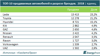Рейтинг наиболее востребованных казахстанцами брендов по результатам 2018 года возглавляет Lada: на территории республики продано 13,4 тысячи автомобилей российской марки. Сбыт моделей Toyota составил 12,3 тысячи авто. Третью позицию занял Hyundai с показателем 8,7 тысячи машин. Пятёрку лидеров замыкают KIA (2,9 тысячи) и GAZ (2,7 тысячи проданных авто). В TOP-10 наиболее успешных марок вошли также Nissan (2,4 тысячи авто), Renault (2 тысячи), Ravon (1,7 тысячи), Volkswagen (1,5 тысячи) и UAZ (1,5 тысячи авто).