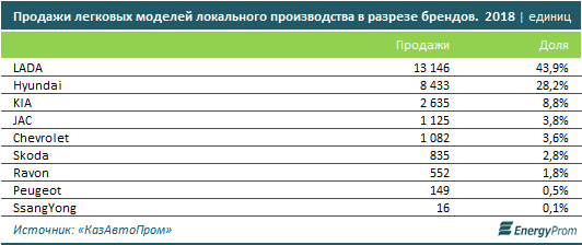 Пятёрку наиболее востребованных у автолюбителей брендов легковых авто казахстанской сборки по итогам 2018 года составили Lada (13,1 тысячи автомобилей), Hyundai (8,4 тысячи), KIA (2,6 тысячи), JAC (1,1 тысячи) и Chevrolet (1,1 тысячи). В список марок, предлагаемых отечественными предприятиями, вошли также Skoda (835 авто), Ravon (552), Peugeot (149) и SsangYong (16).