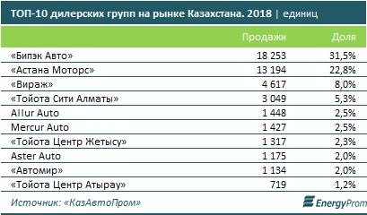 Статус крупнейшей дилерской группы на рынке Казахстана, по информации Союза предприятий автомобильной отрасли, сохраняет за собой холдинг «Бипэк Авто – Азия Авто». По итогам отчётного периода 31,5% всех покупателей новых легковых автомобилей (включая малотоннажные грузовые автомобили) остановили выбор на предложениях этой группы.