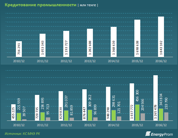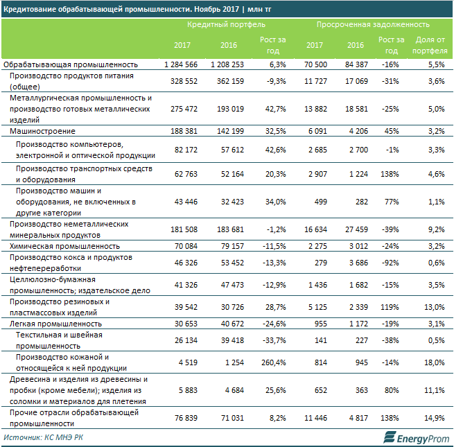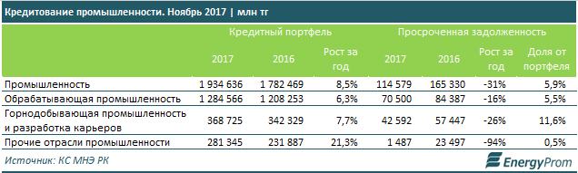 По итогам ноября 2017 объем займов в промышленную сферу достиг 1,9 триллиона тенге — на 2,3% больше, чем месяцем ранее, и сразу на 8,5% больше, чем в аналогичном периоде годом ранее.