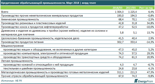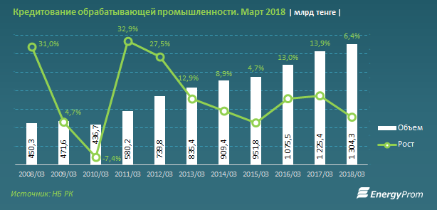 Объем кредитования обрабатывающей промышленности на конец марта 2018 года составил 1,3 трлн тг, рост за год — на 6,4%.