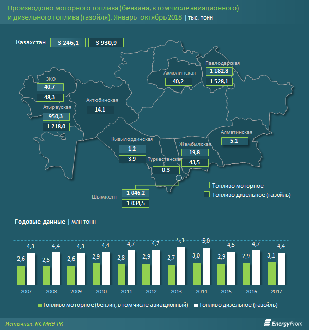 32,2% производства бензина и 26,3% выпуска дизельного топлива обеспечил Шымкент, где работает Шымкентский НПЗ — ТОО «ПетроКазахстан Ойл Продактс» (ПКОП).
