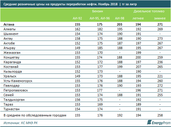 В ноябре 2018 года в среднем по городам страны цены на популярный бензин АИ-92 снизились на 4,4%, до 155 тенге за литр. Стоимость АИ-95/96 также снизилась (почти на 1%, до 176 тенге за литр), а на АИ-98 — увеличилась (почти на 2% за год, до 192 тенге за литр).