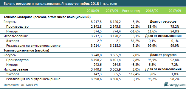 По итогам января–сентября 2018 года казахстанские производители обеспечивают уже более 88% спроса на бензин, при этом 99,9% реализуется на внутреннем рынке. Благодаря росту производства и политике импортозамещения в секторе, импорт бензина сократился почти на 52% за год, до 374,5 тыс. тонн. Экспорт увеличился на 34,2% за год, однако его объёмы ожидаемо незначительны — всего 2,9 тыс. тонн.
