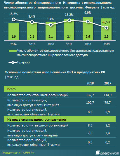 За пятилетку (февраль 2014–2019 гг.) число абонентов фиксированного интернета с использованием высокоскоростного широкополосного доступа выросло с 1,9 млн до 2,5 млн. Среднегодовые темпы роста составили 6,9%. Впрочем, по итогам февраля текущего года количество абонентов сократилось на 6,5% к аналогичному периоду годом ранее.