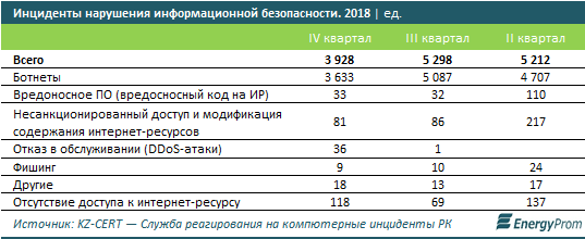 Согласно отчетам KZ-CERT — Службы реагирования на компьютерные инциденты РК — за четвёртый квартал 2018 года было зарегистрировано 3,9 тыс. инцидентов — на 25,9% меньше, чем в третьем квартале. На ботнеты* приходится 92,5% инцидентов, или 3,6 тыс.
