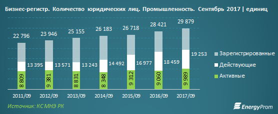Уровень бизнес-активности в промышленности ниже, чем в среднем по всем отраслям в РК. Так, по итогам сентября, в промсекторе экономическую деятельность осуществляли 9,99 тысячи компаний — это 51,9% от всех действующих предприятий в секторе, и 33,4% — от всех зарегистрированных.