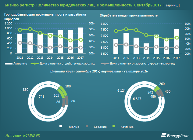 В то же время, по сравнению с прошлым годом число активно работающих индустриальных предприятий значительно увеличилось — сразу на 10,3% (при росте в среднем по РК на 10,2%).