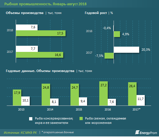 Казахстанские рыбозаводчики за 8 месяцев текущего года произвели 17,5 тыс. тонн свежей, охлажденной и мороженой рыбы (на 4,9% больше, чем в аналогичном периоде годом ранее), а также 7,6 тысячи тонн переработанной и консервированной рыбы, икры, ее аналогов и заменителей (впрочем, это чуть меньше — на 0,4% — чем годом ранее).