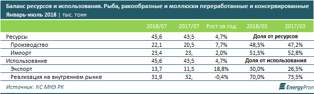Примечательно, что рыбпром страны по данным за январь-июль 2018 перекрывает спрос на рыбу, ракообразные и моллюски наполовину. 51,5% все еще обеспечивает импорт.