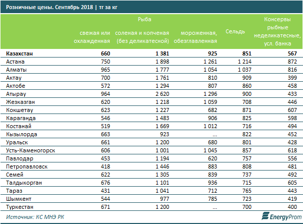 По итогам сентября в магазинах и на базарах страны свежая и охлажденная рыба стоила в среднем 659,6 тг за кг, на 8,1% больше, чем годом ранее, мороженая — 925 тг, на 9,3% больше, чем год назад.