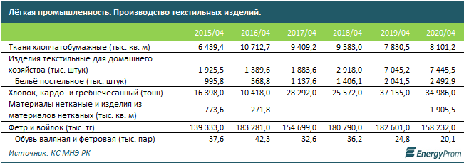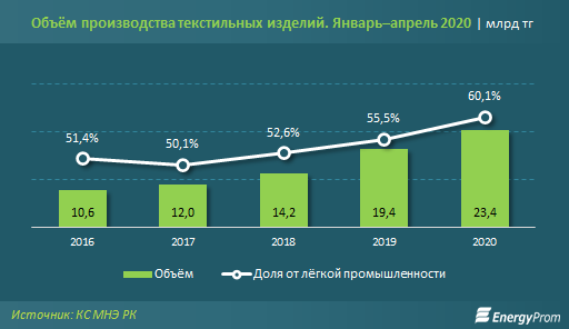 В стоимостном выражении объём производства текстильных изделий за январь–апрель 2020 года составил 23,4 млрд тг — на 20,5% больше, чем в прошлом году (индекс промышленного производства — 113,4%). Доля текстиля от всего объёма производства лёгкой промышленности выросла с 55,5% до 60,1%.