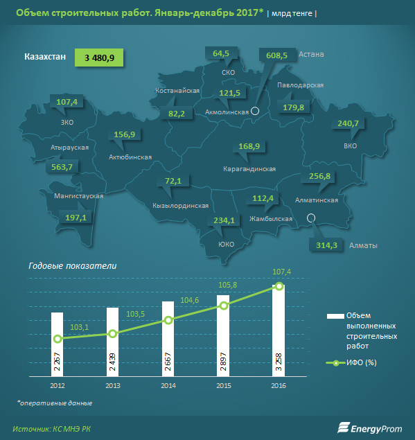 Более трети всех объемов строительных работ пришлось на Астану (608,5 млрд тг, +6,9% за год) и Атыраускую область (563,7 млрд тг, -1,7% за год).