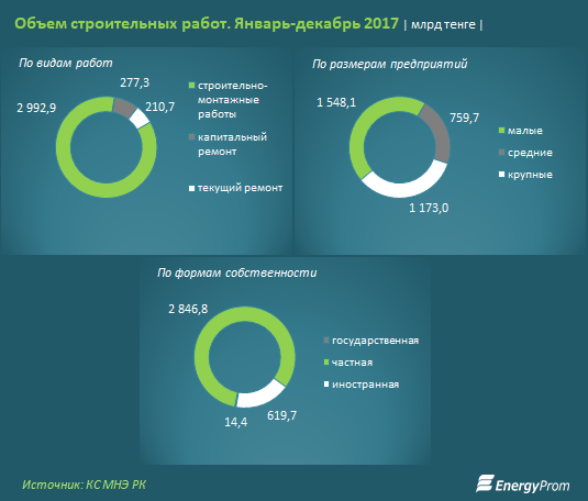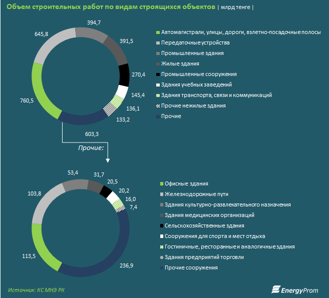 Кроме того, 11,2% строительных работ пришлось на жилстрой. Здесь застройщики мощно поддерживаются госпрограммой жилищного строительства «Нұрлы жер».