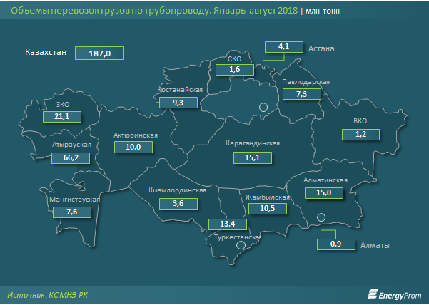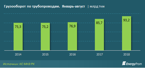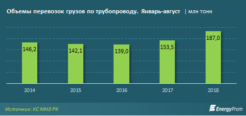 Объемы транспортировок по трубопроводам РК растут второй год подряд, и составили за январь-август 2018 года 187 млн тонн, что на 21,8% больше, чем за аналогичный период прошлого года.