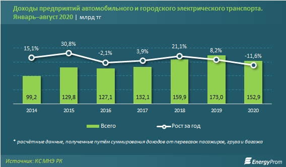 По итогам 8 месяцев текущего года доходы компаний автомобильного и городского электрического транспорта составили 152,9 млрд тг, уменьшившись сразу на 11,6% за год. Для сравнения: в прошлом году доход составлял 173 млрд тг, увеличившись на 8,2% за год.