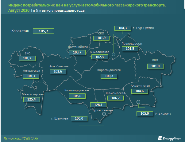 В августе цены на услуги автомобильного пассажирского транспорта выросли на 5,7% по сравнению с августом прошлого года. Почти во всех регионах страны услуги подорожали, лишь в Шымкенте цена осталось неизменной.