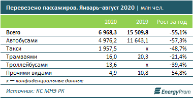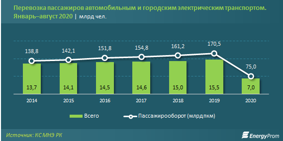 За январь–август 2020 года автомобильным и городским электрическим транспортом перевезли 7 млрд человек — в 2,2 раза меньше, чем в аналогичном периоде годом ранее. Непосредственно в августе перевезли 260,9 млн пассажиров — на 5,4% больше, чем в июле, и в 7,9 раза меньше, чем в августе 2019-го.