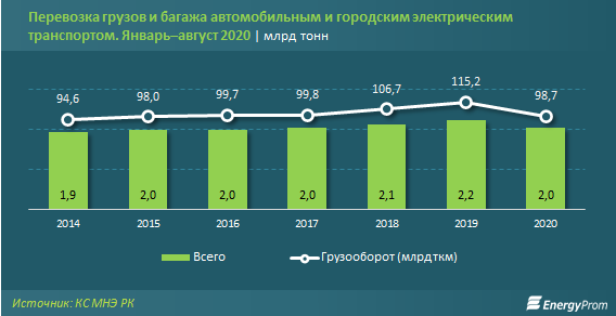 Груза и багажа автомобильным транспортом перевезли 2 млрд тонн — на 8,5% меньше, чем в прошлом году. В августе было перевезено 299,7 млн тонн багажа — на 1,3% меньше, чем в предыдущем месяце, и на 7,2% меньше, чем в августе 2019 года.