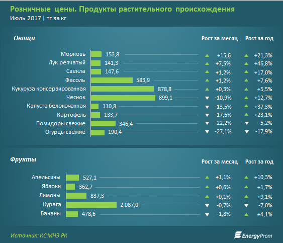 В июле, несмотря на сезон и новый урожай, на розничном рынке вновь наблюдается рост цен на некоторые овощи: так, морковь подорожала на 15,6% за месяц, до 153,8 тг за кг, лук — на 7,5%, до 141,3 тг за кг, свекла и фасоль — на 1,2%, до 147,6 и 583,9 тг за кг, соответственно.