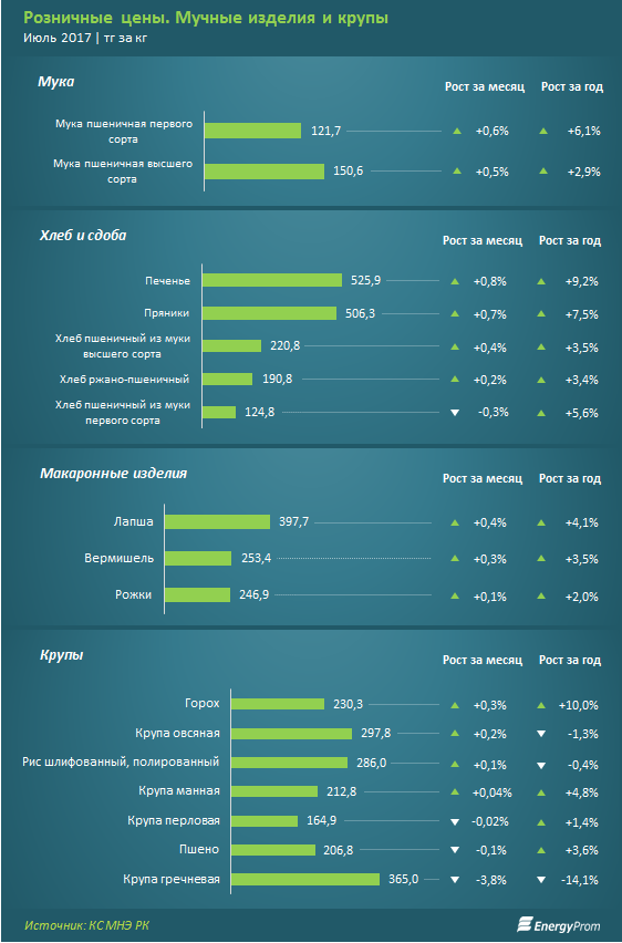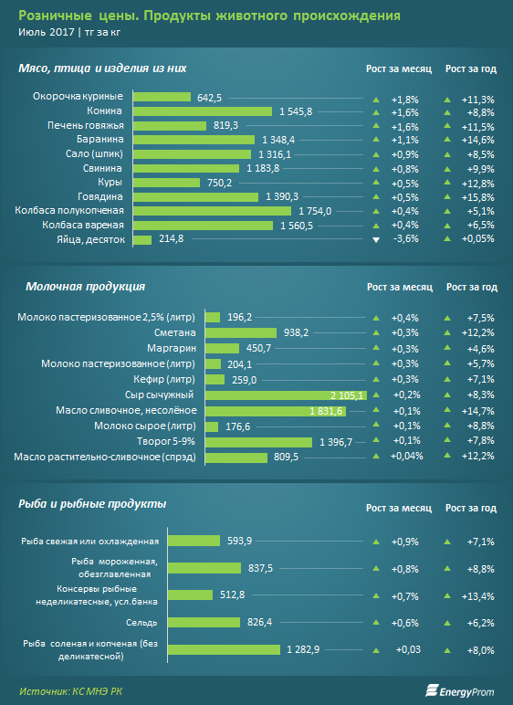 Примечательно, что, хотя по итогам прошлого месяца, июня, инфляция составляла 7,5% за год, и все еще оставалась в пределе коридора, назначенного Нацбанком (менее 8%), продовольственные товары показали годовой рост цен почти на 10%. Более того, глава Нацбанка допускает, что инфляция может выйти за верхний предел коридора (то есть будет выше 8%) и шоковые предложения на рынке продовольственных товаров будут продолжаться.