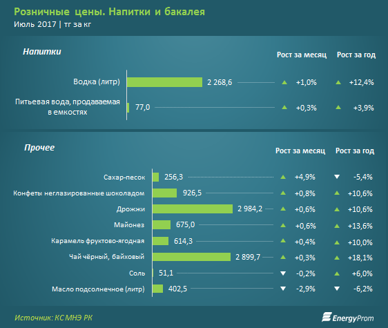 Еще одна неприятность для казахстанцев — рост цен на сахар в сезон консервирования и заготовки фруктов и овощей: +4,9% за месяц, до 256,3 тг за кг. Причем в июне сахар уже успел вырасти в цене на 4% к маю.