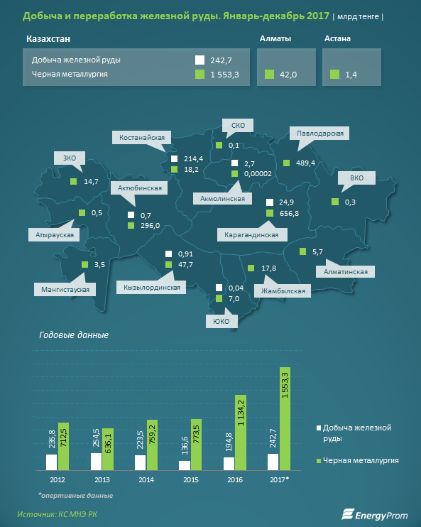 За 2017 год казахстанские компании добыли железной руды на 242,7 млрд тг — это на 25,9% больше, чем годом ранее*.