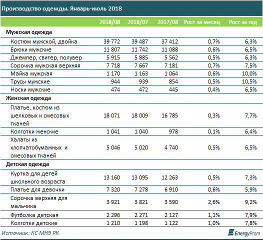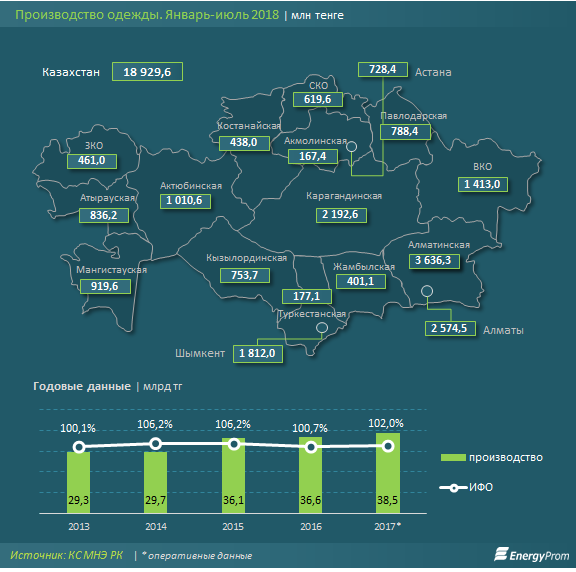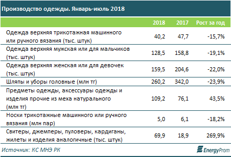Среди регионов РК самый большой объем производства одежды в стоимостном выражении за январь-июль 2018 года был в Алматинской области — 3,6 млрд тг, что сразу на 15,7% меньше, чем в прошлом году.