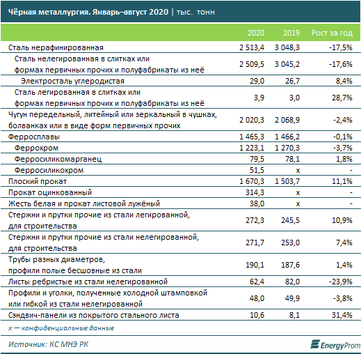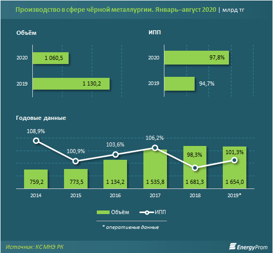 Производство в сфере чёрной металлургии за январь–август 2020 года в денежном выражении составило 1,1 трлн тг — на 6,2% меньше, чем за январь–август 2019-го (ИПП — 97,8%). Объёмы выпуска снижаются второй год подряд, в прошлом году в аналогичном периоде сокращение достигло 6,8% (ИПП — 94,7%).