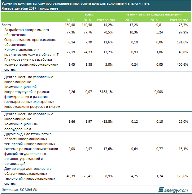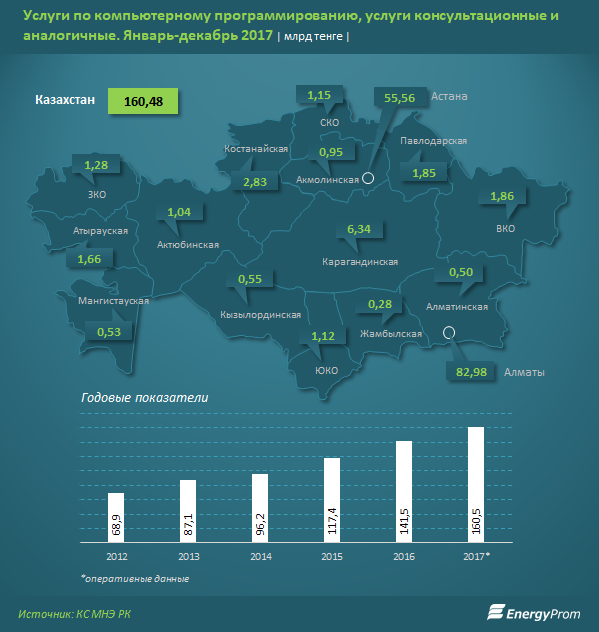 За 2017 год объем услуг по компьютерному программированию, а также консультационных и прочих аналогичных услуг в секторе составил более 160 миллиардов тенге — на 14,2% больше, чем годом ранее*.