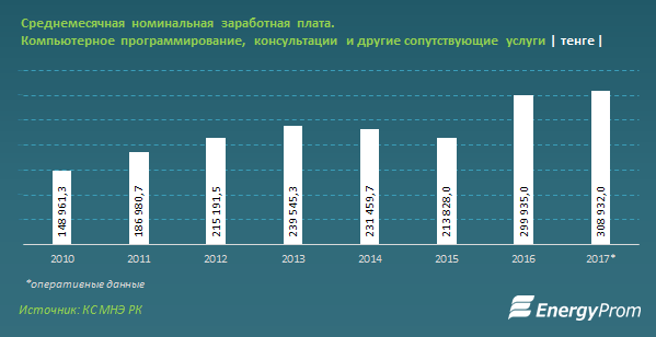 Впрочем, программисты, кодировщики и прочие специалисты IT-сферы все еще получают более чем вдвое выше средней по РК зарплаты — 308,9 тысячи тенге (при средней в целом по всем отраслям по итогам января-декабря 2017 года — 149,7 тыс. тг).