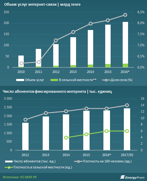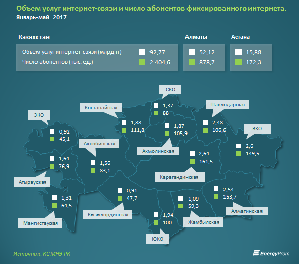 За январь-май 2017 объем услуг интернет-провайдеров вырос на 9,9%, до 92,77 млрд тг.