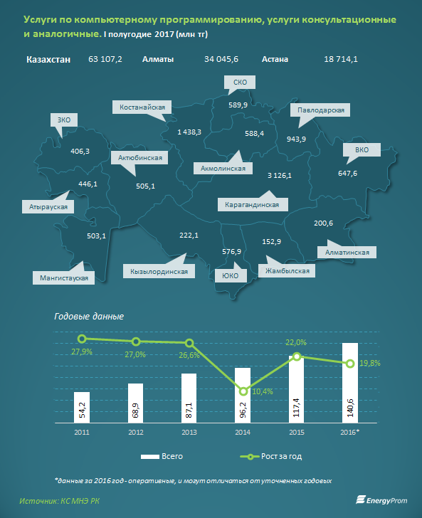 Объем услуг по компьютерному программированию и консультациям достиг 63,1 млрд тг по итогам I полугодия 2017 — это на 10,9% больше, чем в аналогичном периоде прошлого года.