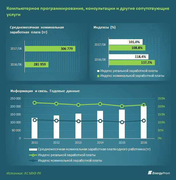 Наряду с объемом услуг, растут и заработные платы программистов и специалистов IT-сферы. Так, по итогам I полугодия 2017 работники отрасли получали в среднем 306,78 тысячи тенге в месяц — это на 8,8% больше, чем в аналогичном периоде годом ранее.