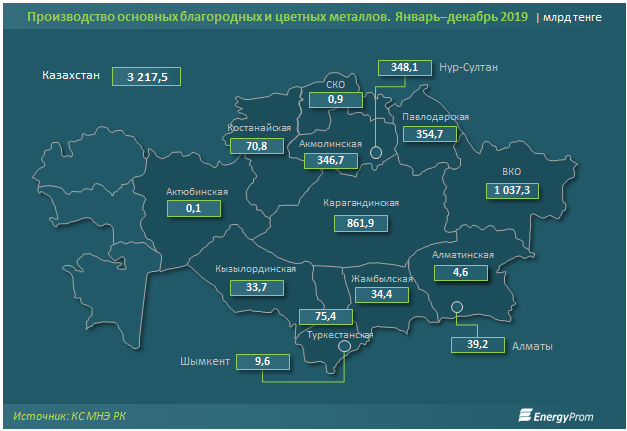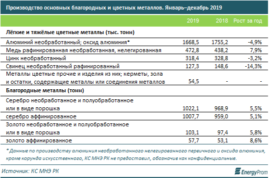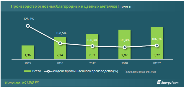 За январь–декабрь 2019 года в Казахстане производство основных благородных и цветных металлов достигло 3,2 трлн тенге, рост промышленного производства с учётом инфляции составил 6,8%.