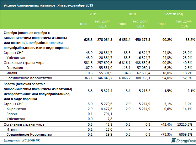 Экспорт необработанного и полуобработанного золота составил 3,3 тонны (5,3 млн долл. США). Основой импортёр золота — Кыргызстан (88% в натуральном выражении и 84,1% — в стоимостном).