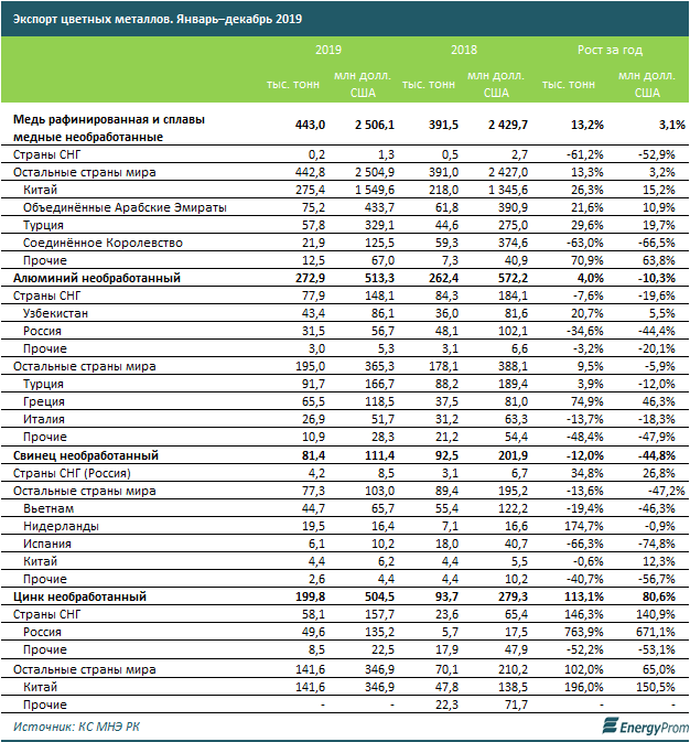 Основные импортёры казахстанской меди — Китай, ОАЭ и Турция; алюминия — Турция, Греция и Узбекистан; свинца — Вьетнам и Нидерланды; цинка — Китай и Россия.